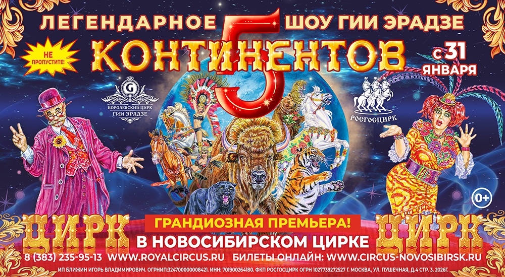 Легендарный продюсерский центр «Королевский цирк Гии Эрадзе» вновь отправляется в Новосибирск! Вот уже много лет подряд Заслуженный артист РФ Гия Эрадзе приезжает в Новосибирский цирк с масштабным цирковым шоу, которое неизменно становится главным культурным событием в жизни города. Зрители Новосибирского цирка уже знакомы с флагманским проектом «Королевский цирк», впечатлены грандиозным «Бурлеском», очарованы великолепной «Песчаной сказкой». Представления произвели на публику неизгладимое впечатление. Каждый показ собирал полный зал зрителей, а медиапространство пестрило восторженными отзывами! Весь год на официальный сайт «Королевского цирка» приходило множество писем с просьбой привезти новое цирковое шоу в Новосибирский государственный цирк. И вот, с 31 января 2026 г. Заслуженный артист РФ Гия Эрадзе совместно с компанией «Росгосцирк» представят публике Новосибирска легендарное шоу «5 континентов», в неизменно лучших традициях уже полюбившегося жителям и гостям города «Королевского цирка»!